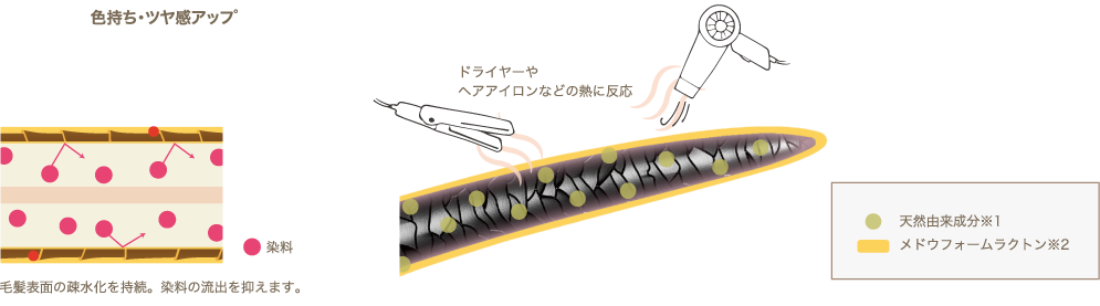 毛髪補修成分のメドウフォーム-δ-ラクトンがドライヤーの熱に反応して毛髪表面の疎水化を持続化させ、ツヤ感、ヘアカラーの色持ちを持続させます。
